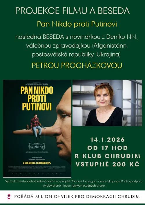 Projekce filmu Pan Nikdo proti Putinovi a následná beseda s novinářkou z deníku N, válečnou zpravodajkou (Afgánistán, postsovětské republiky, Ukrajina) Petrou Procházkovou.